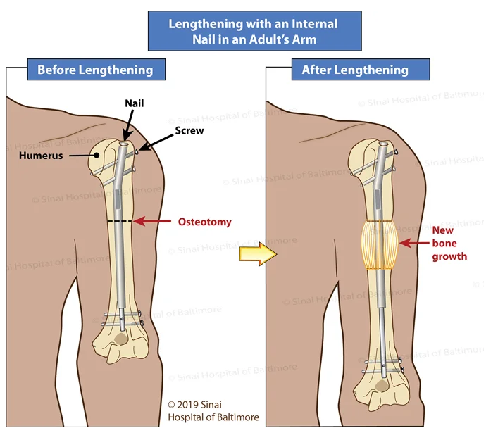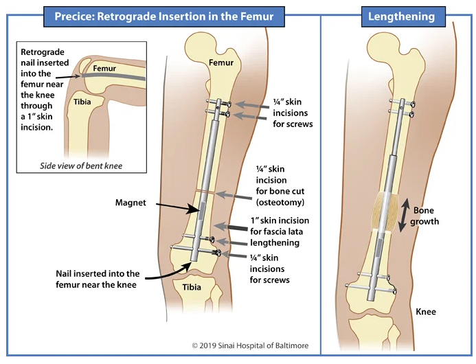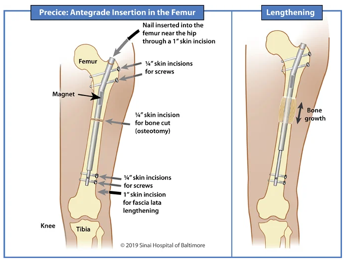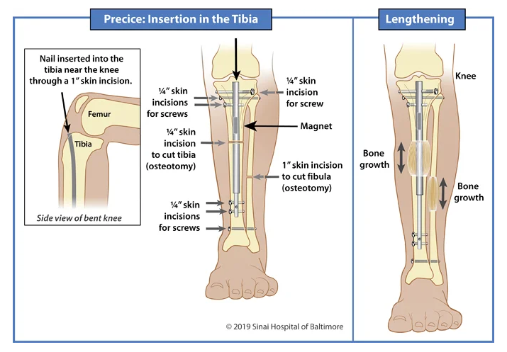 The Precice Lengthening System (NuVasive Specialized Orthopedics, San Diego, CA) consists of a telescoping metal rod, called a lengthening nail, with a magnetic motor inside of it. The nail is inserted through a small incision into the bone canal where the bone marrow is found. The patient is given a special device called an External Remote Controller (ERC) that is used to make the Precice nail slowly lengthen. The ERC has a magnet inside it that rotates. When the ERC is placed against the leg or arm and turned on, the movement of the magnet inside the ERC causes the magnetic motor inside the Precice to slowly lengthen. When the Precice lengthens, the bone also lengthens. Will Precice lengthening hurt?Precice lengthening with the ERC is so gradual that nearly all of our patients have told us that their leg does not hurt during the lengthening sessions. What is our center’s experience with the Precice?The original physician development team for the Precice nail consisted of Dr. Shawn Standard and Dr. John Herzenberg, both from the International Center for Limb Lengthening, and Dr. Stuart Green. These doctors worked with a company to produce this revolutionary new internal lengthening nail. Our doctors have been using the Precice system since 2012. The first model that was released was a modular design that was composed of two sections assembled at the time of surgery. The newer model is a single piece, which makes the nail much stronger. We have found the Precice to be very effective in helping our patients. In the first 100 bones that we treated, 96% achieved the lengthening goal. In another study that we conducted, patients had lengthening with external fixation and then later had lengthening with the Precice. All the patients in the study preferred lengthening with the Precice over external fixation. They said that they had less pain, found physical therapy to be easier and liked the cosmetic appearance of the leg/arm better after treatment with Precice. Since 2012, surgeons at the International Center for Limb Lengthening have implanted more than 710 Precice nails. Will the Precice be a good option for every person who needs limb lengthening?The Precice nail is offered in several lengths and diameters, but a person’s bone may still be too small for it. The diameter of the bone must be wide enough so that the Precice can fit inside the bone canal. The doctor will measure the diameter of the bone on an X-ray. The Precice is offered in three diameters: 8.5, 10.7 and 12.5 mm (0.33, 0.42, 0.50 inches). The bone also needs to be long enough to fit the Precice. The shortest nail is 6.3 inches (160 mm) for the tibia and 6.7 inches (170 mm) for the femur. The doctor will measure the length of the bone on an X-ray to see if it is long enough to accommodate the Precice nail. Another factor that must be considered is whether the ERC can be placed close enough to the Precice to make it lengthen. Soft-tissues (muscle, fat, skin) can be so thick that the ERC cannot be placed close enough to the Precice to activate lengthening. To see if the Precice will work for a patient, the doctor will measure the distance from the bone canal to the skin on an X-ray. People are not good candidates for the Precice if they have a pacemaker or know that they will need an MRI scan in the next year. It is generally not recommended to have an MRI scan when a person has a Precice nail implanted. Therefore, we routinely recommend removal of the Precice about one year after surgery, provided that the lengthened bone is fully healed. Can the Precice internal nail be used in children?A Precice nail may be inserted in a child’s thigh bone (femur) starting at about age eight years. For the shin bone (tibia), it is preferable to wait until close to skeletal maturity (age 14 years in girls and age 16 years in boys). How much will the Precice lengthen a bone?The bone is lengthened in very small amounts each day until the lengthening goal is achieved. The maximum amount that can be lengthened depends on which model of the Precice is used. Different Precice models can lengthen the bone a total of 1.2 inches (30 mm), 2 inches (50 mm) or 3 inches (80 mm). For example, if the shortest Precice is the only one that fits in the bone, the patient may be limited to lengthening a total of 1.2 inches. In most cases, we can implant the models that allow 2 to 3 inches of length. To help you prepare for limb lengthening surgery success, we have developed this brochure of prehabilitation stretches to perform in the months prior to surgery. This is not medical advice; please consult with your doctor before beginning any exercise regime. What should be done to prepare for surgery?Please visit our Before Surgery section for detailed information. During the visit with the doctor, ask for our guide to prepare for surgery. When planning for Precice surgery, you should also be aware of the following: